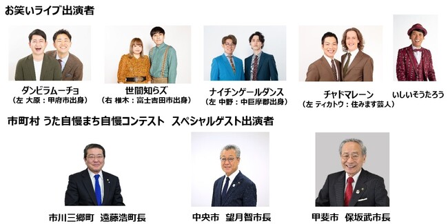 スペシャル企画「市町村長うた自慢まち自慢コンテスト」には、市川三郷町の遠藤浩町長、中央市の望月智市長、甲斐市の保坂武市長が参加し、地元の魅力をPRいただくとともに、ご自慢の歌声を披露いただきます。