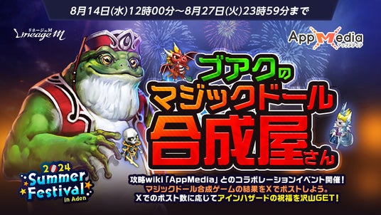 PCオンラインRPG「リネージュ」のモバイル版タイトル『Lineage M(以下、リネージュM)』のサービス、運営をしているエヌ・シー・ジャパン株式会社(本社:東京都港区、代表取締役:林 元基(イム ウォンキ)、以下エヌシージャパン)は、2024年8月14日(水)に、攻略wikiメディア「AppMedia」とのコラボレーションイベント「ブアクのマジックドール合成屋さん」の開始、ゲーム内イベント2種の開始をお知らせします。