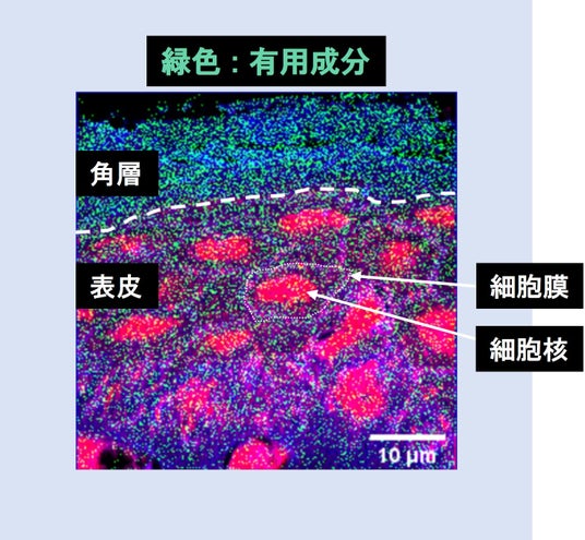図1 本分析技術による観測例: 有用成分が角層・細胞膜・細胞核に浸透している様子