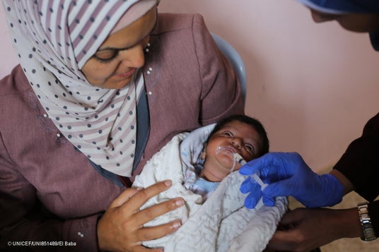 ガザ地区で、ユニセフ支援物資の治療用ミルクを口にする子ども(パレスチナ、2025年8月7日撮影) (C) UNICEF/UNI851489/El Baba