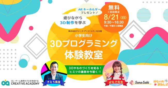 株式会社クリーク・アンド・リバー社(C&R社)が運営する「C&R Creative Academy」は8月21日(日)、株式会社SonoSakiの協力のもと、小学生を対象とした3DCGプログラミング教室「みらいのおねんど特別教室」を開催いたします。