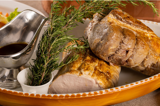 ポークロース肉のグリエ トリュフ風味ソース、燻製サーモンのたたき 大葉のマヨネーズソース、