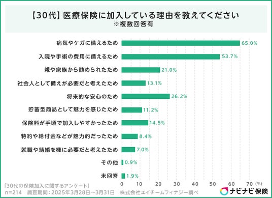 これらのことから、30代は将来の健康リスクと医療費への不安から、経済的な備えとして医療保険への加入をしていることが考えられます。