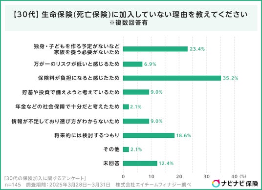 生命保険(死亡保険)に加入していない理由としては、「保険料が負担になると感じたため」(35.2%)が最も多く、次いで「独身・子どもを作る予定がないなど家族を養う必要がないため」(23.4%)、「将来的には検討するつもり」(18.6%)という結果になりました。