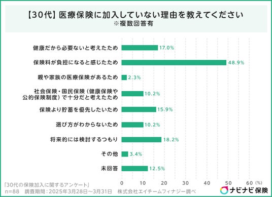 医療保険に加入していない理由としては、「保険料が負担になると感じたため」(48.9%)が最も多く、次いで「将来的には検討するつもり」(18.2%)、「健康だから必要ないと考えたため」(17.0%)という結果になりました。