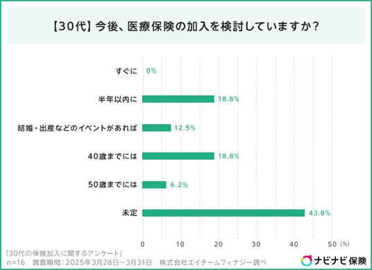 「将来的には検討するつもり」と回答した人の中で、いつ頃の加入を検討しているか尋ねたところ、「未定」(43.8%)で最も多く、具体的な検討時期が定まっていない人が多いことが分かりました。