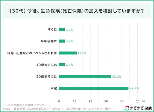 「将来的には検討するつもり」と回答した人の中で、いつ頃の加入を検討しているか尋ねたところ、医療保険と同じく「未定」(44.4%)の人が多いことが分かりました。