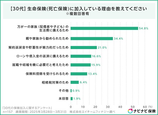 生命保険の加入理由は、「万が一の家族(配偶者や子ども)の生活費に備えるため」(54.8%)が最も多く、次いで「親や家族から勧められたため」(34.4%)、「解約返戻金や貯蓄性が魅力的だったため」(21.0%)という結果になりました。