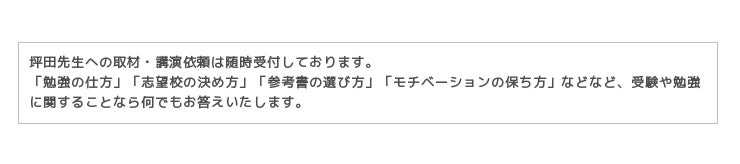 集団塾・個別指導塾時代から中学校・高校・大学受験指導で腕をふるい、坪田塾では教室責任者として指導をしてきた。現在は「N塾」の事業部長として、東大 を目指す生徒の指導をしている。1年でセンター試験「日本史B」を30点台から90点台に、「世界史B」の模試で満点など、のべ1,500人以上の生徒を 劇的に伸ばしてきた。指導教科は「日本史」「世界史」など「社会」全般、「数学」「英語」。大学で、教授・講師を対象に「学生への授業の方法」の講演もし ている。