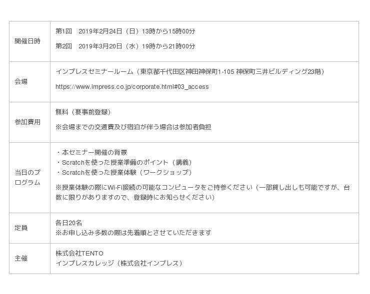 インプレスグループでIT関連メディア事業を展開する株式会社インプレス(本社:東京都千代田区、代表取締役社長:小川 亨)は、『できるキッズ 子どもと学ぶ Scratchプログラミング入門』の著者で、子どもプログラミング教室の草分けである株式会社TENTO(本社:埼玉県川口市、代表取締役社長:竹林 暁)と共同で、『スクラッチを使って子どもにプログラミングを教えよう!』セミナーを、2019年2月24日(日)と、3月20日(水)に開催します。参加費は無料です。