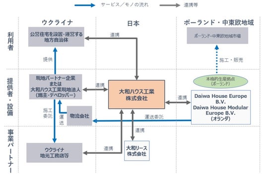 当事業においては、当社が創業以来培ってきたプレハブ技術を活用した住宅の仮設生産施設をポーランドに設置し、同国からウクライナへ輸送、建設、供給を行う予定としています。