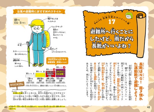 本書は天災だけではなく、海で溺れたり、熱中症になったり、はたまた下校時に不審者に遭遇したり……などの対処法を幅広く紹介して、子どもが助かるための技術をオールカラーの図解入りで指南する、ジュニア向けサバイバル本です。親子で読めば、なお安心!