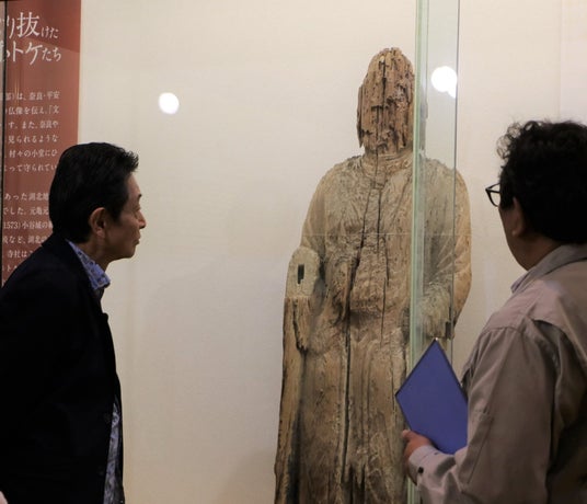 次に2人が向かったのは、高月の歴史を語るには欠かせない【高月観音の里歴史民俗資料館】。長浜市高月町は、平安時代などの仏像が数多く残り、日本有数の観音信仰の地として知られています。こちらでは、それらの貴重な観音様が保管されているんです。非常に良い状態で残っている仏像もありますが、写真の仏像は全身が朽ち果てて傷んでいます。これには大きな理由があるそうで……。
