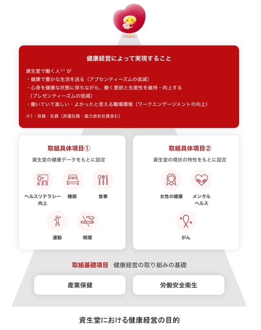当社は、企業使命「BEAUTY INNOVATIONS FOR A BETTER WORLD(美の力でよりよい世界を)」を実現するため、それを実行する社員やその家族がみずから美しく健やかに生活することが重要だと考え、「資生堂健康宣言」を策定しています。代表取締役 会長 CEO魚谷雅彦が健康管理責任者となり、人財本部ウェルネスサポートグループと資生堂健康保険組合が協働して各事業所(国内資生堂グループ)をサポートし、社員の健康保持・増進活動を積極的にけん引しています。また、健康管理責任者より各役員・部門長・責任者へ働きかけ、社員の自主的な健康への取り組みを支援しています。