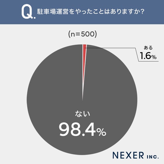 その結果「ある」と回答した方がわずか1.6%で、「ない」が98.4%と圧倒的多数を占めました。駐車場運営は土地活用の手段として知られているものの、実際に経験している人はごくわずかであることがわかります。