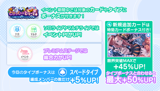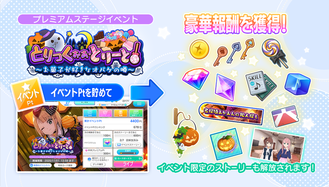 さらに、今回のピックアップ対象カードはハロウィンイベント「とりっく・おあ・とりーと!~お菓子が好きなオバケの噂~」にてイベントPtの獲得量がアップする「特効カードボーナス」を持っています。