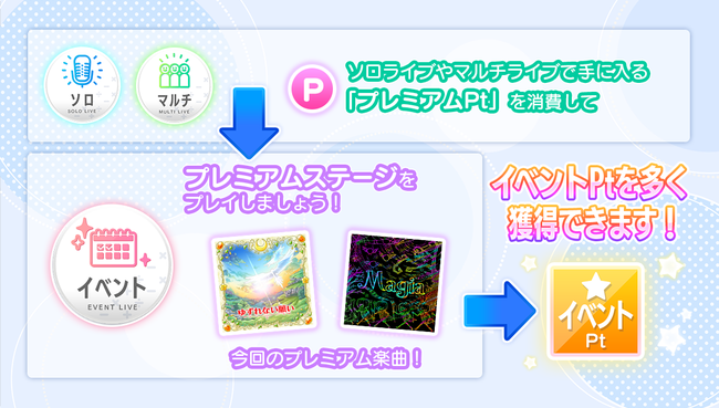 イベント期間中にライブをプレイすると、クリア時にイベントPtとプレミアムPtを入手できます。