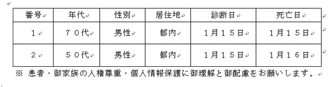 2022-01-20 東京都 新型コロナウイルスに関連した患者の死亡について Tweet ~新型コロナウイルスに関する東京都からのお知らせ~ 都内で新型コロナウイルスに感染した方が死亡されましたのでお知らせします。 お亡くなりになった方のご冥福をお祈り申し上げます。 企業プレスリリース詳細へ PR TIMESトップへ 公式ツイッター Follow @Straightpress 最新情報をTwitterで受け取ろう! 公式フェイスブックページ 最新情報をFacebookで受け取ろう! 前の記事 一覧へ戻る 次の記事
