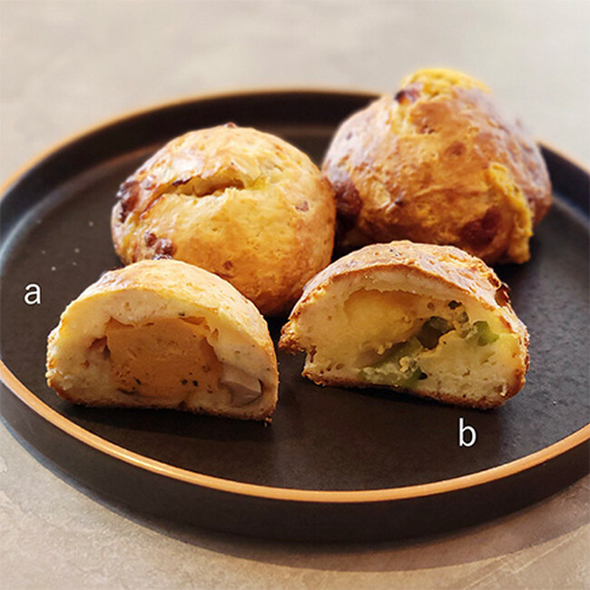 b.珍しい巨峰のドライレーズンを、ほんのり甘いかぼちゃを練り込んだ生地の中にたっぷり入れた秋を感じるスコーンです。