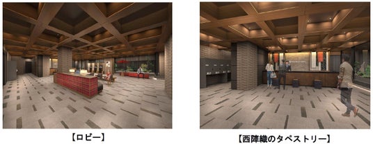 あわせて、ロビーなどの共用部も大幅にリニューアルしました。ロビーは木目や石などをベースに赤い和傘や縁台などの差し色を加え、京都らしい洗練された空間に一新しました。フロントのバックパネルには鮮やかな西陣織を重ねたタペストリーを設え、柱には京扇子を展示。各階のエレベーターホールにも玉砂利や灯籠を配置し、落ち着いた雰囲気を演出します。