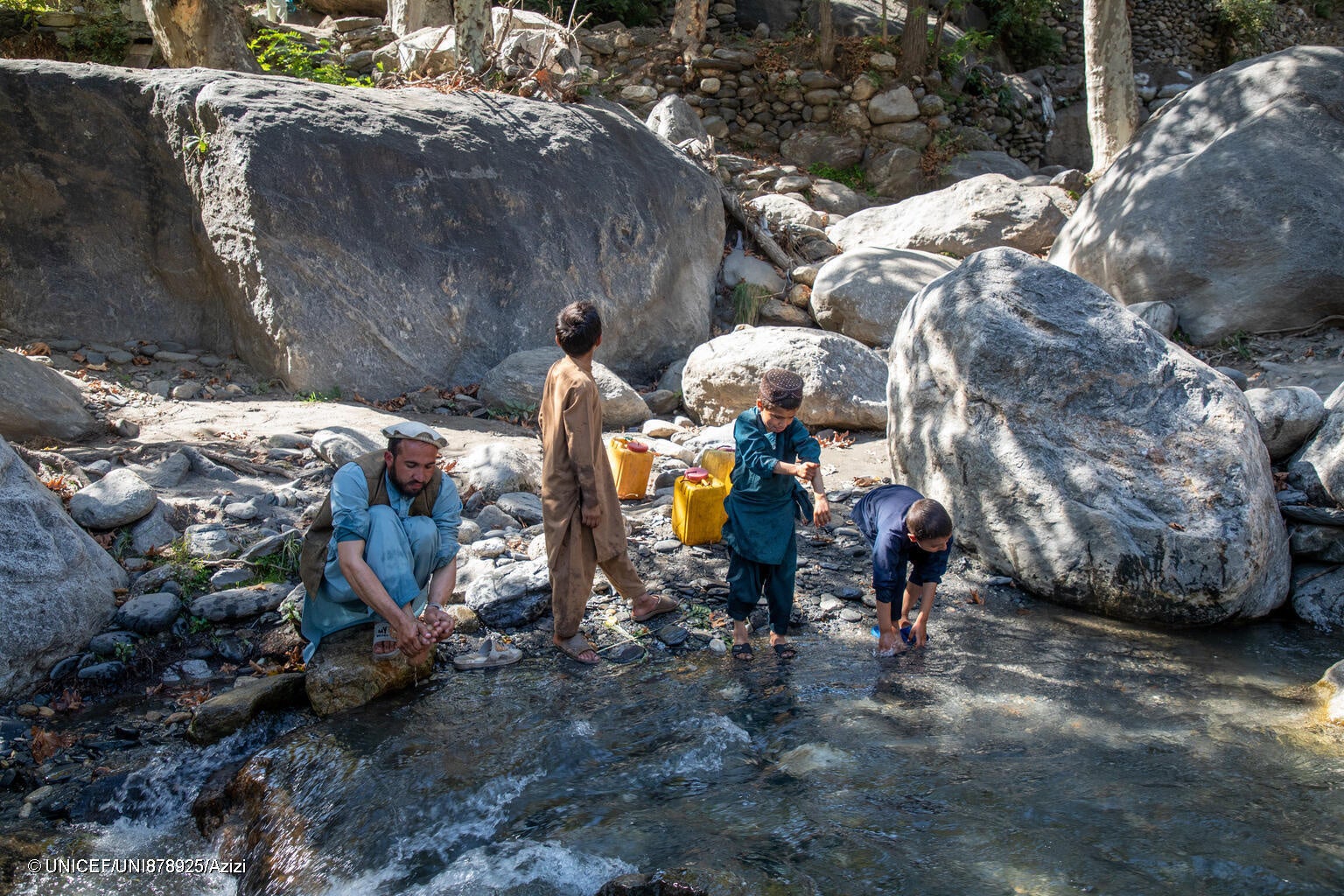 クナール県で、仮設シェルターで寝起きをしている家族が、小川で水をくむ様子(アフガニスタン、2025年10月14日撮影)(C) UNICEF/UNI878925/Azizi