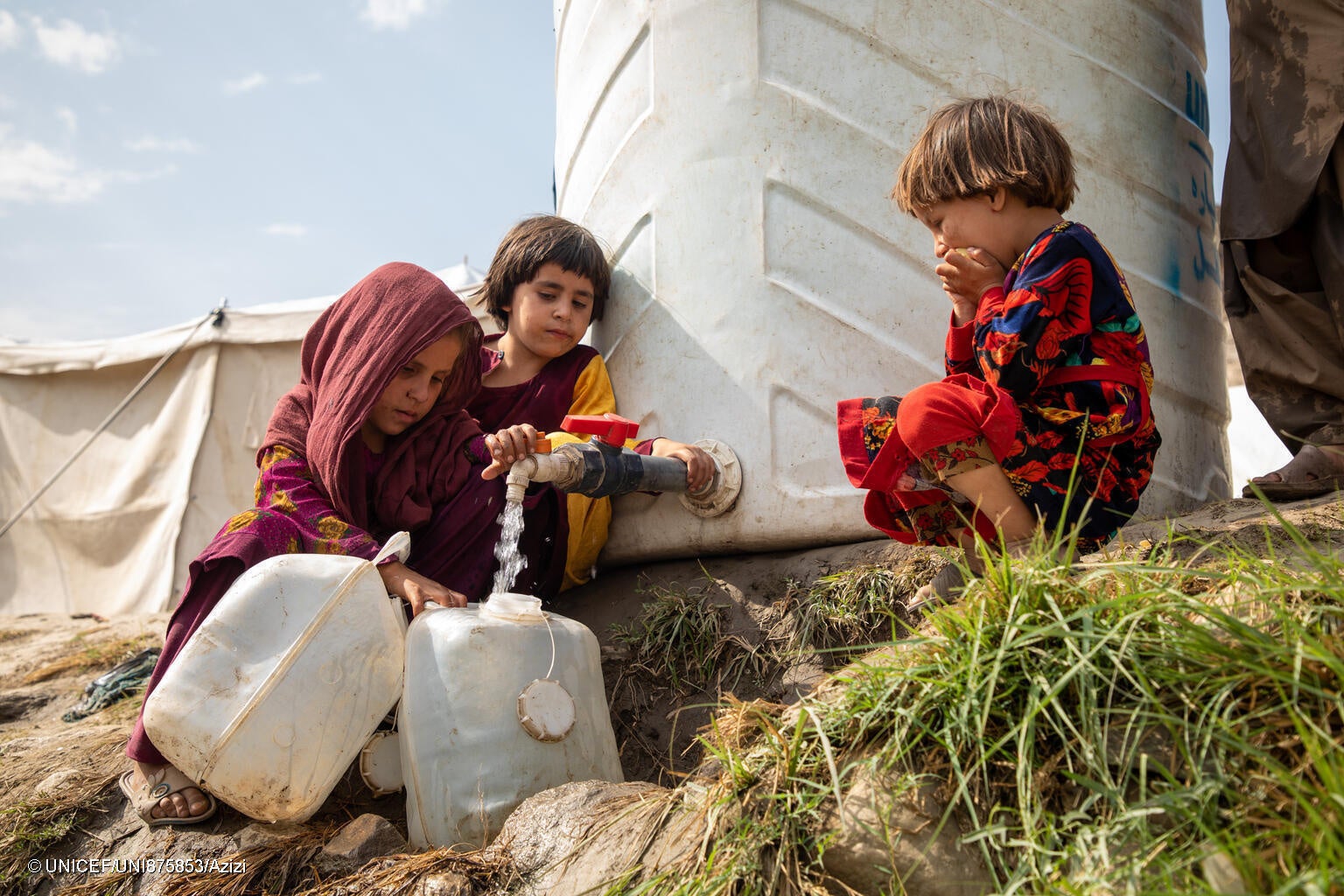 地震の被災者が暮らすSawki Zor Kali避難民キャンプで、給水設備から水をくむ7歳のハリマさん(左)(アフガニスタン、2025年9月25日撮影) (C) UNICEF/UNI875853/Azizi