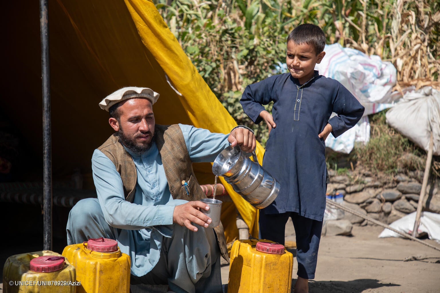 クナール県で、地震に遭って家を失い、仮設シェルターで暮らす親子。生活用水と飲み水を得るために、一日に何度も小川まで水をくみに行っている(アフガニスタン、2025年10月14日撮影) (C) UNICEF/UNI878929/Azizi