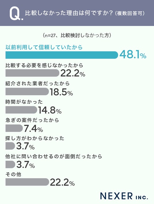 次いで「比較する必要を感じなかったから」が22.2%、「紹介された業者だったから」が18.5%、「時間がなかった」が14.8%と続きます。