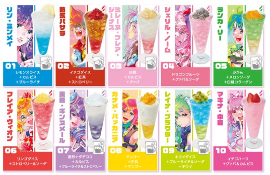 コラボドリンクは、「マクロス」の歌姫をイメージした「リン・ミンメイ」「熱気バサラ」「ミレーヌ・フレア・ジーナス」「シェリル・ノーム」「ランカ・リー」「フレイア・ヴィオン」「美雲・ギンヌメール」「カナメ・バッカニア」「レイナ・プラウラー」「マキナ・中島」の全10種をご用意します。