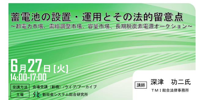 本セミナーでは、蓄電池の運用による取引の枠組み、設置・運用におけるリスク、及び資金調達について解説します。