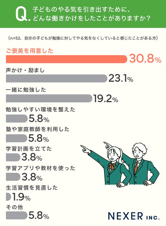 ■「ご褒美を用意した」が30.8%で最多。子どものやる気を引き出すために親が行った工夫