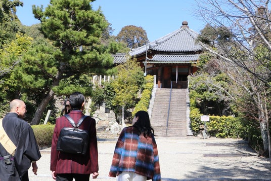 金堂、五重塔、大講堂を案内していただいた後、向かったのは住職おすすめのスポット【西円堂(さいえんどう)】。階段を上がって振り返ると、奈良盆地が広がる素晴らしい景色が!