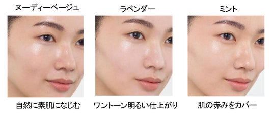 色調は自然に素肌になじむヌーディーベージュ、ワントーン明るい仕上がりのラベンダー、赤みカバー効果のあるミントの3色です。