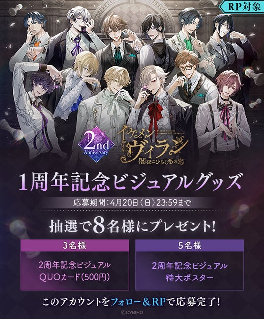 株式会社サイバード(本社:東京都品川区、代表取締役社長 兼 CEO 長嶋 貴之、以下「サイバード」)が手掛ける、全世界でのシリーズ累計会員数4,000万人を誇る女性向け恋愛ゲーム「イケメンシリーズ」の人気作『イケメンヴィラン 闇夜にひらく悪の恋』(以下、『イケメンヴィラン』)は、本日2025年3月28日(金)でサービス開始より2周年を迎えました。この日を迎えられたのは、ファンの皆さまが彼らに変わらぬ愛を注いでくださったおかげです。深くお礼を申し上げます。