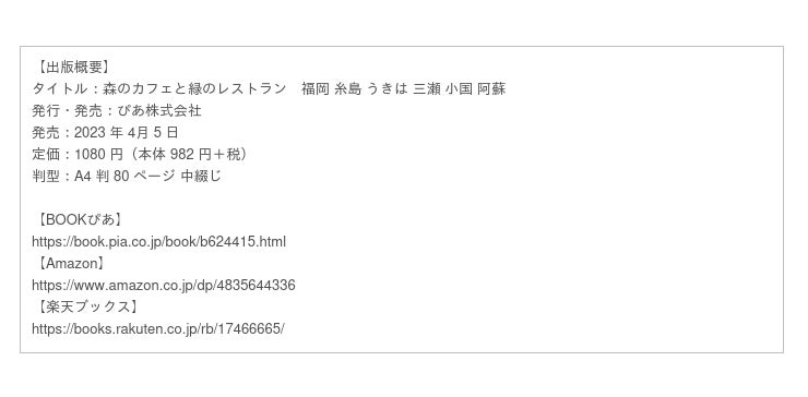 本日4月5日、ぴあ株式会社より、ぴあMOOK『森のカフェと緑のレストラン 福岡 糸島 うきは 三瀬 小国 阿蘇』が発売となりました。