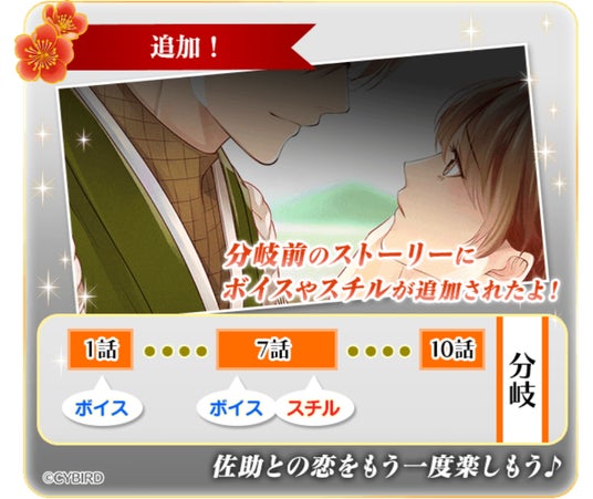 ・「猿飛佐助」本編の1話と7話のストーリーにボイスやスチルが追加されています。もう一度1話から本編を読む方にもよりリッチにお楽しみいただけます。
