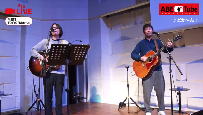 TOKYO FMをはじめとするJFN全国38局フルネットで放送中の、平均的なサラリーマンの日常を描いた大人気ラジオドラマ『NISSAN あ、安部礼司~BEYOND THE AVERAGE~』(日曜日17:00~17:55放送)では、1月9日(日)16時から、オンライン生配信イベント「NISSAN あ、安部礼司 オンラインフェスティバル2022『ABE Tube』」をTOKYO FM公式YouTube LIVEとLINE LIVEにて開催しました。16時台は、ドラマの舞台となっている神保町の喫茶店「さぼうる」からの全国のリスナーと映像でつながる生トーク、17時台は、生放送の裏側を映像生配信、そして18時台に行った生ラジオドラマでは、ゲストにピアニストのまなまる、そして真心ブラザーズを迎え生演奏とラジオドラマのコラボレーションをお届けしました。なお、YouTube Live、LINE LIVE合わせた累計視聴者数は、約13万人に上りました。TOKYO FMの公式YouTubeチャンネルでは、第3部の生ラジオドラマのアーカイブ配信が、2022年3月末まで視聴可能です。