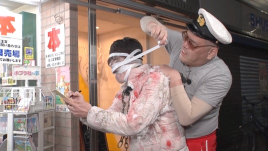 1月19日(月)放送の#3では、商店街ロケのオープニングに突如現れた“ゾンビ化”したしずる・純を救うため、『MAD5』がロケをしながら“純を人間に戻す方法”を探すことに。商店街を歩きながら、ハリウッドザコシショウは「ネギが解毒になる」と商店街でネギを購入。先端を切ったネギを「口開けて」と嫌がる“純ゾンビ”の口元へ近づけます。なかなか口を開けない“純ゾンビ”でしたが、「薬ですから」と、ネギを口に差し込まれると吐き気を催し「ゔぉえ」と反応。その姿に一同爆笑しました。その後も商店街を巡りながら、くっきー!がビニールテープで“純ゾンビ”の顔面をぐるぐる巻きにしたり、テープを巻かれながら身動きが取れない“純ゾンビ”に川北が「今の気持ちで一句お願いします」と川柳を振ったり、純を救おうとあらゆる手段を試します。