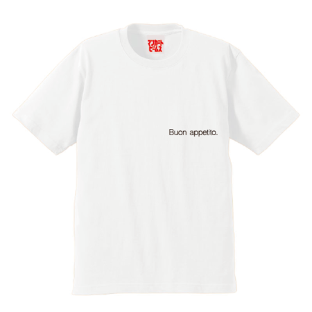 TシャツはビッグT仕様のボディに両面デザインされたもので、フロントにはシンプルに“bon appetit(召し上がれ)”とタイポグラフをレイアウト。