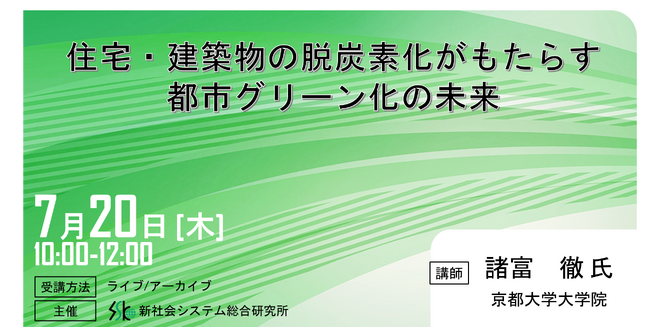 本講演では、住宅・建築物分野の脱炭素化をテーマとし、1.なぜこの分野の炭素化が重要なのか、2.他方でその困難は何なのか、3.この分野における国内外の政策動向のレビュー、4.住宅が蓄電池、EVと結びつくことで、期待されるの分散型エネルギーシステムへの貢献など、近未来への展望も含めてお話ししたい。
