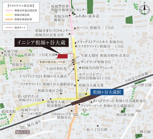 『イニシア祖師ヶ谷大蔵』は、小田急線「祖師ヶ谷大蔵」駅まで徒歩5分、駅からは商店街を抜けた落ち着きある低層住宅街に位置します。駅に近い低層マンションであり、便利な商店街アプローチでありながら現地は静かであることが、お客さまからも評価されています。