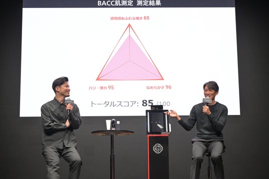 新城さんもおすすめする資生堂のBACC(Beauty Alive Circulation Check)という専用の肌測定機器を使った肌測定について、事前に反町さんには体験してもらいました。結果発表を前に反町さんは少し緊張された様子でしたが、反町さんの結果は、トータルスコアが85点と、高い結果に。