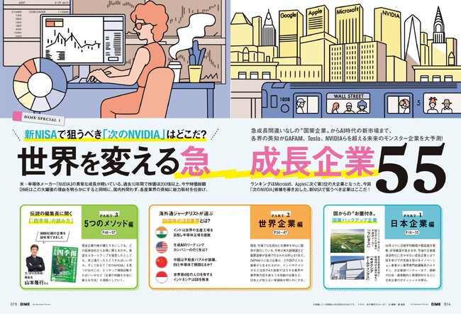 今月のDIMEは「次のNVIDIAを探せ!」をキーワードに次世代の急成長企業について徹底取材! 各業界を知り尽くした業界紙編集長、専門ジャーナリスト、シンクタンク研究員などへの取材を元に国内外の知られざる優良企業や今後成長が期待できる注目企業をピックアップしました。