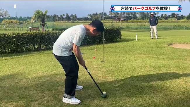 今回一行は、宮崎市青島パークゴルフ場を訪れました。ここは、ふつうのゴルフではなく、1本のクラブと大きなボールを使う“パークゴルフ”が楽しめる施設です。