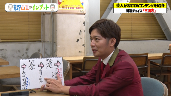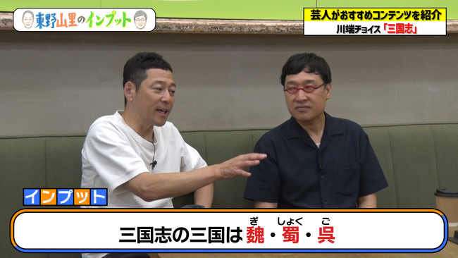 今回のプレゼンターは川端チョイスで、テーマは東野が熱望していた「三国志」です。東野は「俺、三国志を知らんのよね」「(話を)聞いて、今のお笑い界とか芸能界で例えて、コンパクトに覚えたいのよ」と思いを語ります。