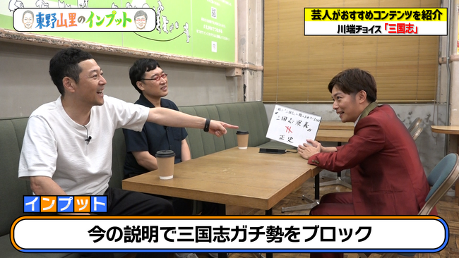 推しの登場人物を探す際、天才軍師・諸葛孔明を見つけた東野は「ダウンタウンさんにおける(放送作家の)高須光聖さんみたいなものよね?」と質問。自分なりに芸人やアニメなどを用いて噛み砕き、川端が教える三国志の世界を理解しようとしました。