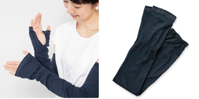 日傘が差せない日でも毎日着けられるアームカバーです。吸水性が高く、なめらかなレーヨン混の綿生地を使っているため心地よい肌ざわりで、腕全体の紫外線対策ができます。また、手がふさがっているときでも身につけられる他、手元の切り込みがV字カットで手作業もしやすいデザインです。