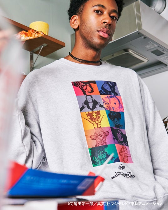 Sweatshirt背面にワッペン風のプリントをあしらったルーズシルエットのフーディー。作中に登場する様々なモチーフをランダムに配置し、エッグヘッド編のポップで刺激的な世界観を表現しました。