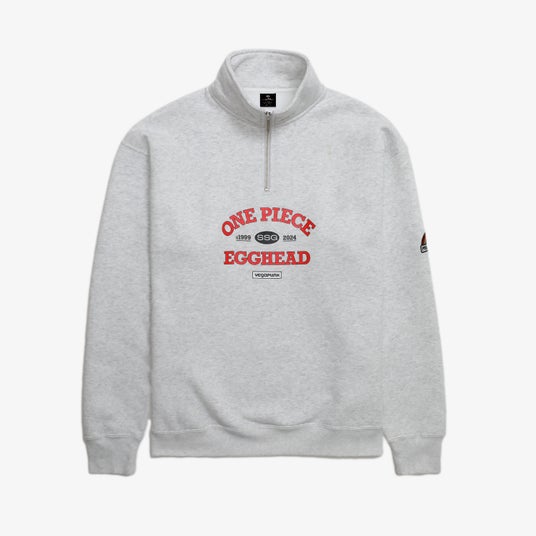 Half Zip Sweat shirtフロントにカレッジロゴ風の『ONE PIECE』テキストロゴを配置したハーフジップタイプのスウェット。左袖にはオリジナルのワッペン刺繍でアクセントを加えました。