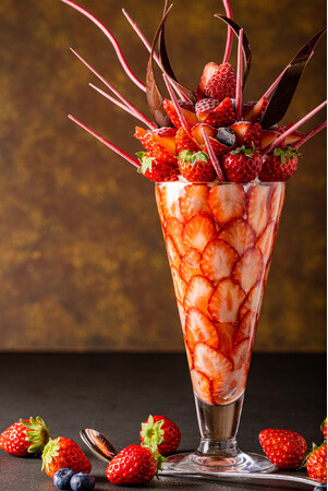 さざ波のように苺スライスを側面に敷き詰め、グラスから溢れんばかりの苺とブルーベリー、ルビーチョコがサンゴを模しています。